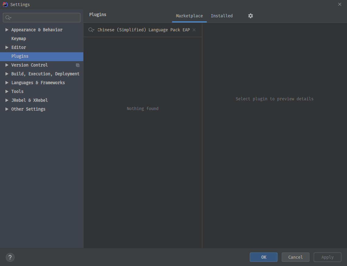 安装完毕后查看版本号 Hepl > About > Build #IU-xxx.xxxx.xxx 如果插件中心可以直接搜索到,直接安装就可以了, File > Settings > Plugins > Chinese (Simplified) Language Pack EAP > Install > 重启即可 另一种是搜索不到的情况 教程比较简单,这里就不说啥了,谢谢