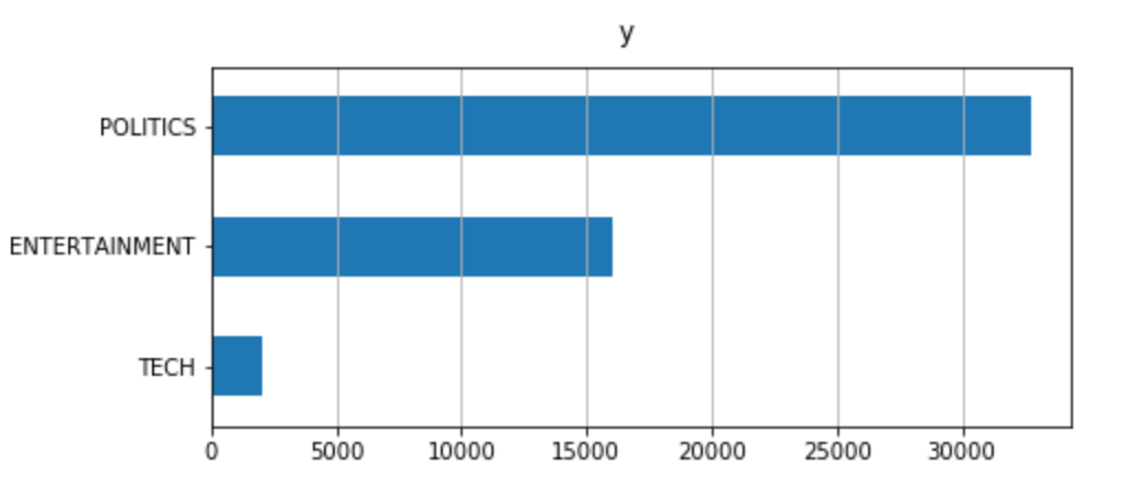 x = "y"fig, ax = plt.subplots() fig.suptitle(x, fontsize=12) dtf[x].reset_index().groupby(x).count().sort_values(by= "index").plot(kind="barh", legend=False, ax=ax).grid(axis='x') plt.show()