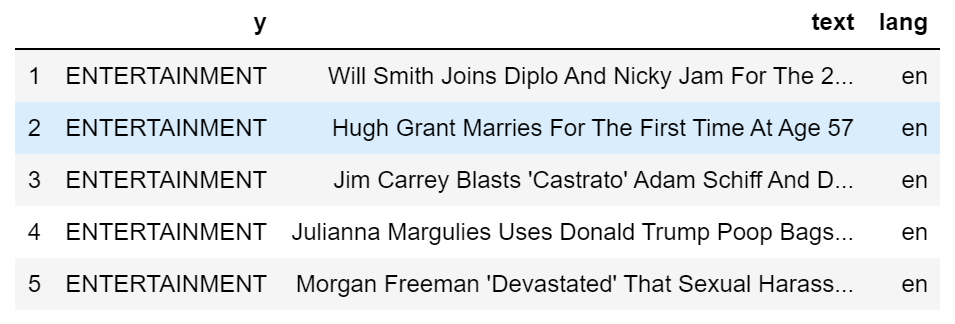 ## create dtf dtf = pd.DataFrame(lst_dics)## filter categories dtf = dtf[ dtf["category"].isin(['ENTERTAINMENT','POLITICS','TECH']) ][["category","headline"]]## rename columns dtf = dtf.rename(columns={"category":"y", "headline":"text"})## print 5 random rows dtf.sample(5)