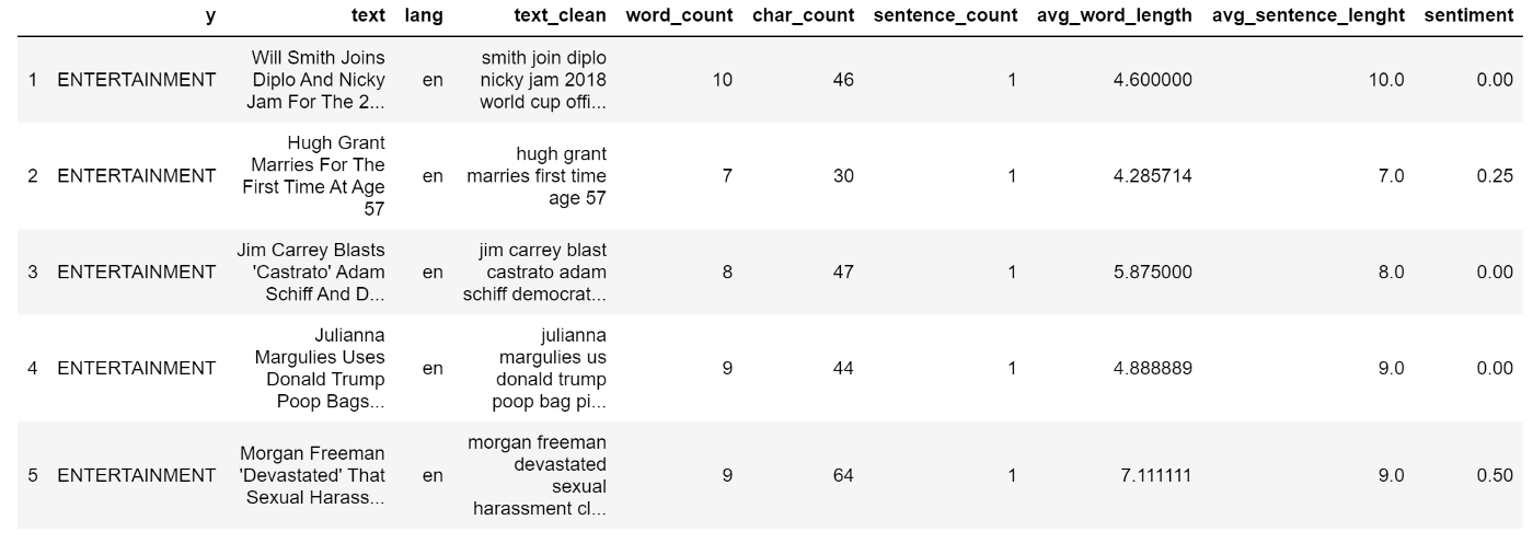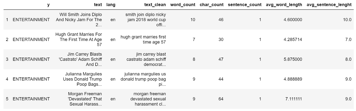 dtf['word_count'] = dtf["text"].apply(lambda x: len(str(x).split(" "))) dtf['char_count'] = dtf["text"].apply(lambda x: sum(len(word) for word in str(x).split(" "))) dtf['sentence_count'] = dtf["text"].apply(lambda x: len(str(x).split("."))) dtf['avg_word_length'] = dtf['char_count'] / dtf['word_count'] dtf['avg_sentence_lenght'] = dtf['word_count'] / dtf['sentence_count'] dtf.head()
