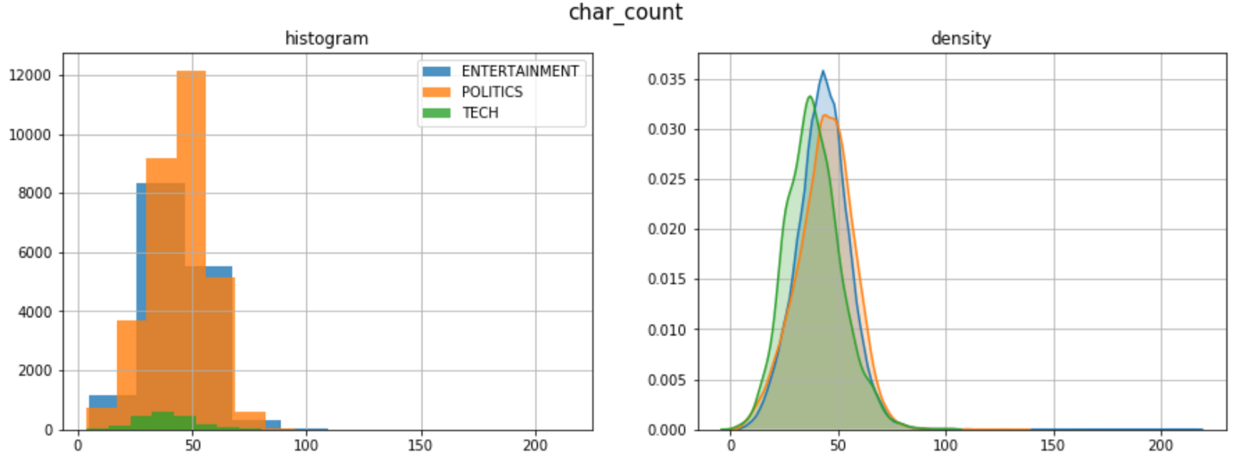 这些新变量相对于目标的分布是什么?为了回答这个问题,我将研究二元分布(两个变量如何一起移动)。首先,我将把整个观察集分成3个样本(政治,娱乐,科技),然后比较样本的直方图和密度。如果分布不同,那么变量是预测性的因为这三组有不同的模式。x, y = "char_count", "y"fig, ax = plt.subplots(nrows=1, ncols=2) fig.suptitle(x, fontsize=12) for i in dtf[y].unique(): sns.distplot(dtf[dtf[y]==i][x], hist=True, kde=False, bins=10, hist_kws={"alpha":0.8}, axlabel="histogram", ax=ax[0]) sns.distplot(dtf[dtf[y]==i][x], hist=False, kde=True, kde_kws={"shade":True}, axlabel="density", ax=ax[1]) ax[0].grid(True) ax[0].legend(dtf[y].unique()) ax[1].grid(True) plt.show()
