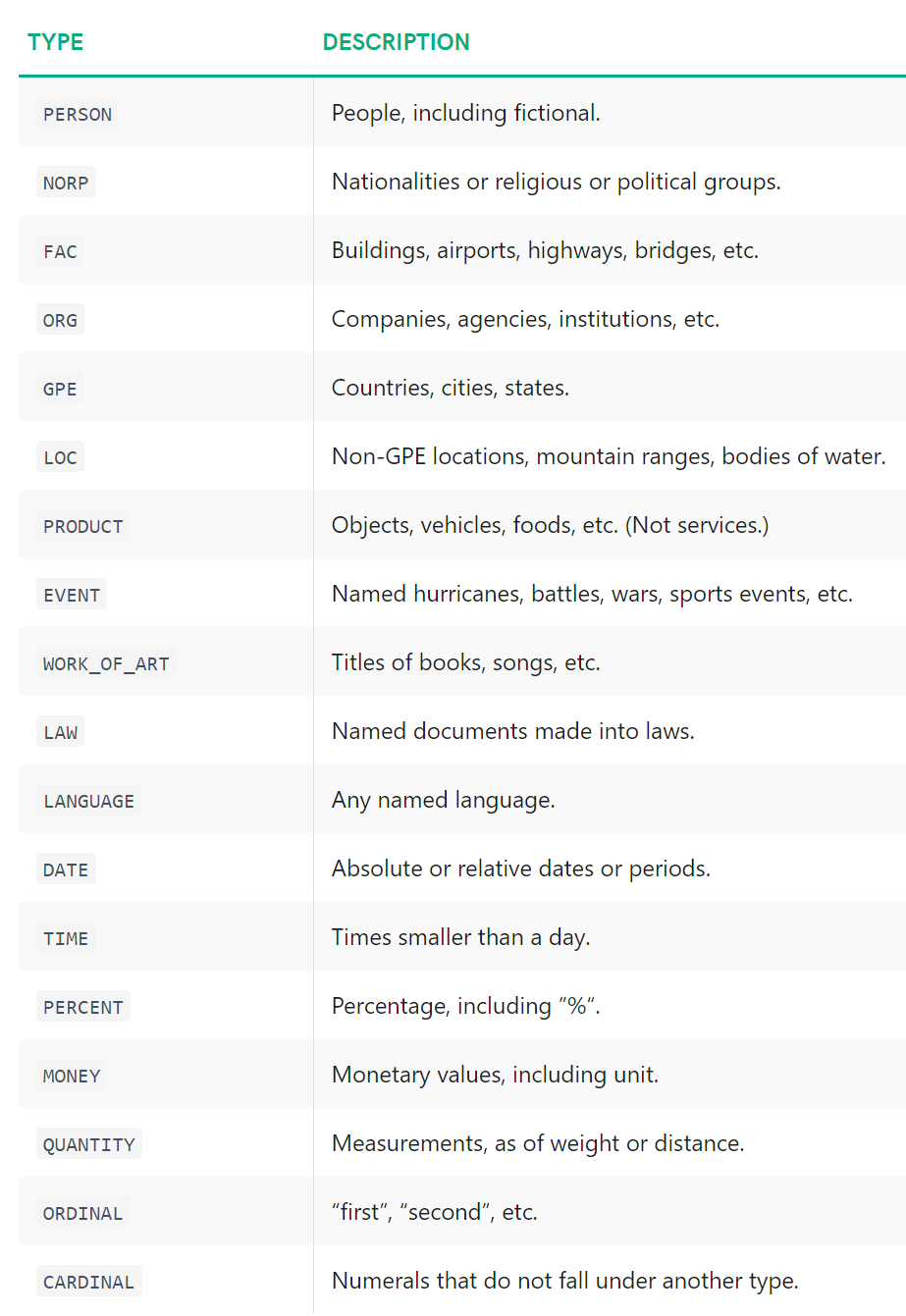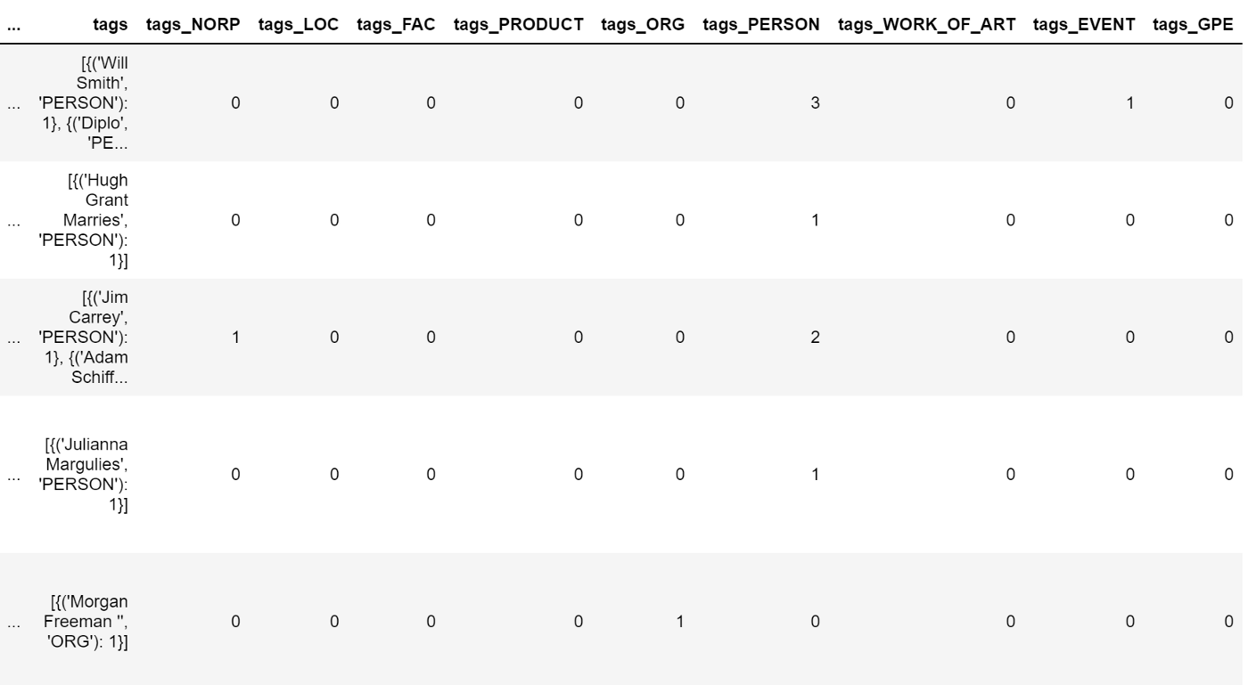 (“The 2018 World Cup’s”, ‘EVENT’):1 }## tag text and exctract tags into a list dtf["tags"] = dtf["text"].apply(lambda x: [(tag.text, tag.label_) for tag in ner(x).ents] )## utils function to count the element of a list def utils_lst_count(lst): dic_counter = collections.Counter() for x in lst: dic_counter[x] += 1 dic_counter = collections.OrderedDict( sorted(dic_counter.items(), key=lambda x: x[1], reverse=True)) lst_count = [ {key:value} for key,value in dic_counter.items() ] return lst_count ## count tags dtf["tags"] = dtf["tags"].apply(lambda x: utils_lst_count(x)) ## utils function create new column for each tag category def utils_ner_features(lst_dics_tuples, tag): if len(lst_dics_tuples) > 0: tag_type = [] for dic_tuples in lst_dics_tuples: for tuple in dic_tuples: type, n = tuple[1], dic_tuples[tuple] tag_type = tag_type + [type]*n dic_counter = collections.Counter() for x in tag_type: dic_counter[x] += 1 return dic_counter[tag] else: return 0 ## extract features tags_set = [] for lst in dtf["tags"].tolist(): for dic in lst: for k in dic.keys(): tags_set.append(k[1]) tags_set = list(set(tags_set)) for feature in tags_set: dtf["tags_"+feature] = dtf["tags"].apply(lambda x: utils_ner_features(x, feature)) ## print result dtf.head()
