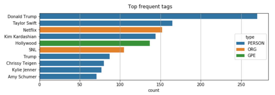 y = "ENTERTAINMENT" tags_list = dtf[dtf["y"]==y]["tags"].sum() map_lst = list(map(lambda x: list(x.keys())[0], tags_list)) dtf_tags = pd.DataFrame(map_lst, columns=['tag','type']) dtf_tags["count"] = 1 dtf_tags = dtf_tags.groupby(['type', 'tag']).count().reset_index().sort_values("count", ascending=False) fig, ax = plt.subplots() fig.suptitle("Top frequent tags", fontsize=12) sns.barplot(x="count", y="tag", hue="type", data=dtf_tags.iloc[:top,:], dodge=False, ax=ax) ax.grid(axis="x") plt.show()