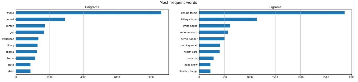 3双字母:“I like”、“like this”、“this article”y = "POLITICS" corpus = dtf[dtf["y"]==y]["text_clean"]lst_tokens = nltk.tokenize.word_tokenize(corpus.str.cat(sep=" ")) fig, ax = plt.subplots(nrows=1, ncols=2) fig.suptitle("Most frequent words", fontsize=15) ## unigrams dic_words_freq = nltk.FreqDist(lst_tokens) dtf_uni = pd.DataFrame(dic_words_freq.most_common(), columns=["Word","Freq"]) dtf_uni.set_index("Word").iloc[:top,:].sort_values(by="Freq").plot( kind="barh", title="Unigrams", ax=ax[0], legend=False).grid(axis='x') ax[0].set(ylabel=None) ## bigrams dic_words_freq = nltk.FreqDist(nltk.ngrams(lst_tokens, 2)) dtf_bi = pd.DataFrame(dic_words_freq.most_common(), columns=["Word","Freq"]) dtf_bi["Word"] = dtf_bi["Word"].apply(lambda x: " ".join( string for string in x) ) dtf_bi.set_index("Word").iloc[:top,:].sort_values(by="Freq").plot( kind="barh", title="Bigrams", ax=ax[1], legend=False).grid(axis='x') ax[1].set(ylabel=None) plt.show()