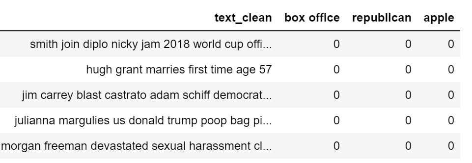 lst_words = ["box office", "republican", "apple"]## count lst_grams = [len(word.split(" ")) for word in lst_words] vectorizer = feature_extraction.text.CountVectorizer( vocabulary=lst_words, ngram_range=(min(lst_grams),max(lst_grams)))dtf_X = pd.DataFrame(vectorizer.fit_transform(dtf["text_clean"]).todense(), columns=lst_words)## add the new features as columns dtf = pd.concat([dtf, dtf_X.set_index(dtf.index)], axis=1) dtf.head()