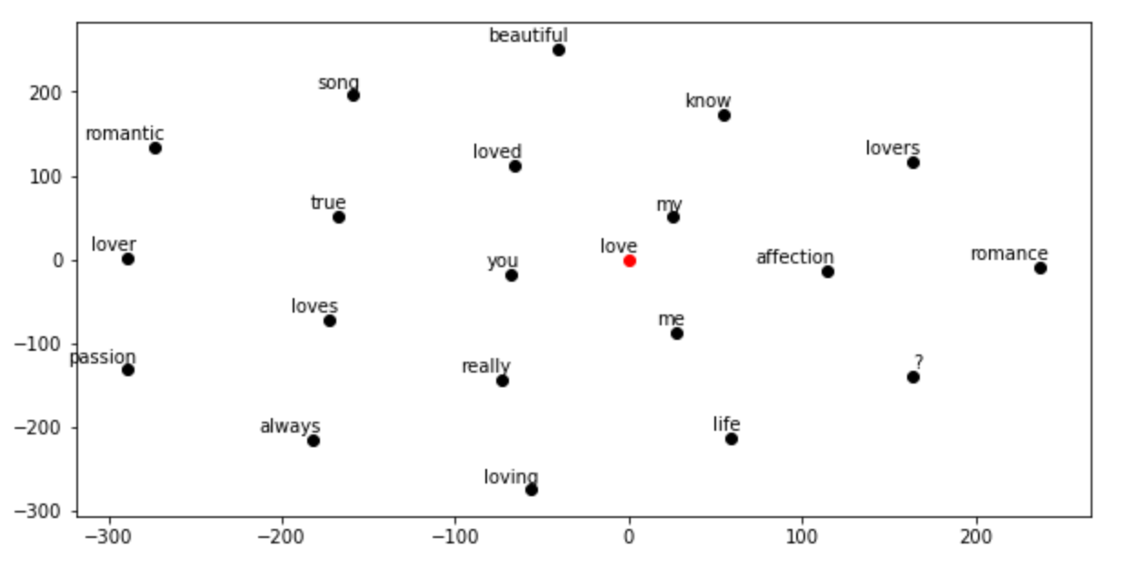 ## find closest vectors labels, X, x, y = [], [], [], [] for t in nlp.most_similar(word, topn=20): X.append(nlp[t[0]]) labels.append(t[0])## reduce dimensions pca = manifold.TSNE(perplexity=40, n_components=2, init='pca') new_values = pca.fit_transform(X) for value in new_values: x.append(value[0]) y.append(value[1])## plot fig = plt.figure() for i in range(len(x)): plt.scatter(x[i], y[i], c="black") plt.annotate(labels[i], xy=(x[i],y[i]), xytext=(5,2), textcoords='offset points', ha='right', va='bottom')## add center plt.scatter(x=0, y=0, c="red") plt.annotate(word, xy=(0,0), xytext=(5,2), textcoords='offset points', ha='right', va='bottom')