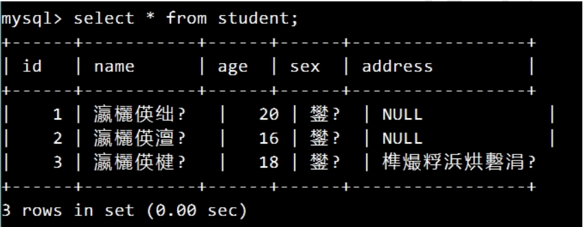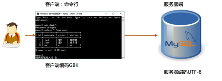 INSERT INTO 表名 (字段名 1, 字段名 2, 字段名 3…) VALUES (值 1, 值 2, 值 3); INSERT INTO 表名 VALUES (值 1, 值 2, 值 3…); INSERT INTO 表名 (字段名 1, 字段名 2, ...) VALUES (值 1, 值 2, ...); 4.2 DOS 命令窗口操作数据乱码问题的解决