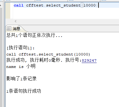 CREATE OR REPLACE PROCEDURE "CFFTEST"."SELECT_STUDENT"("id" IN INT) AS myCount int; BEGIN select count(*) into myCount from cfftest.student where id="id"; if myCount > 0 then select '存在数据'; else select '不存中数据'; end if; END;
