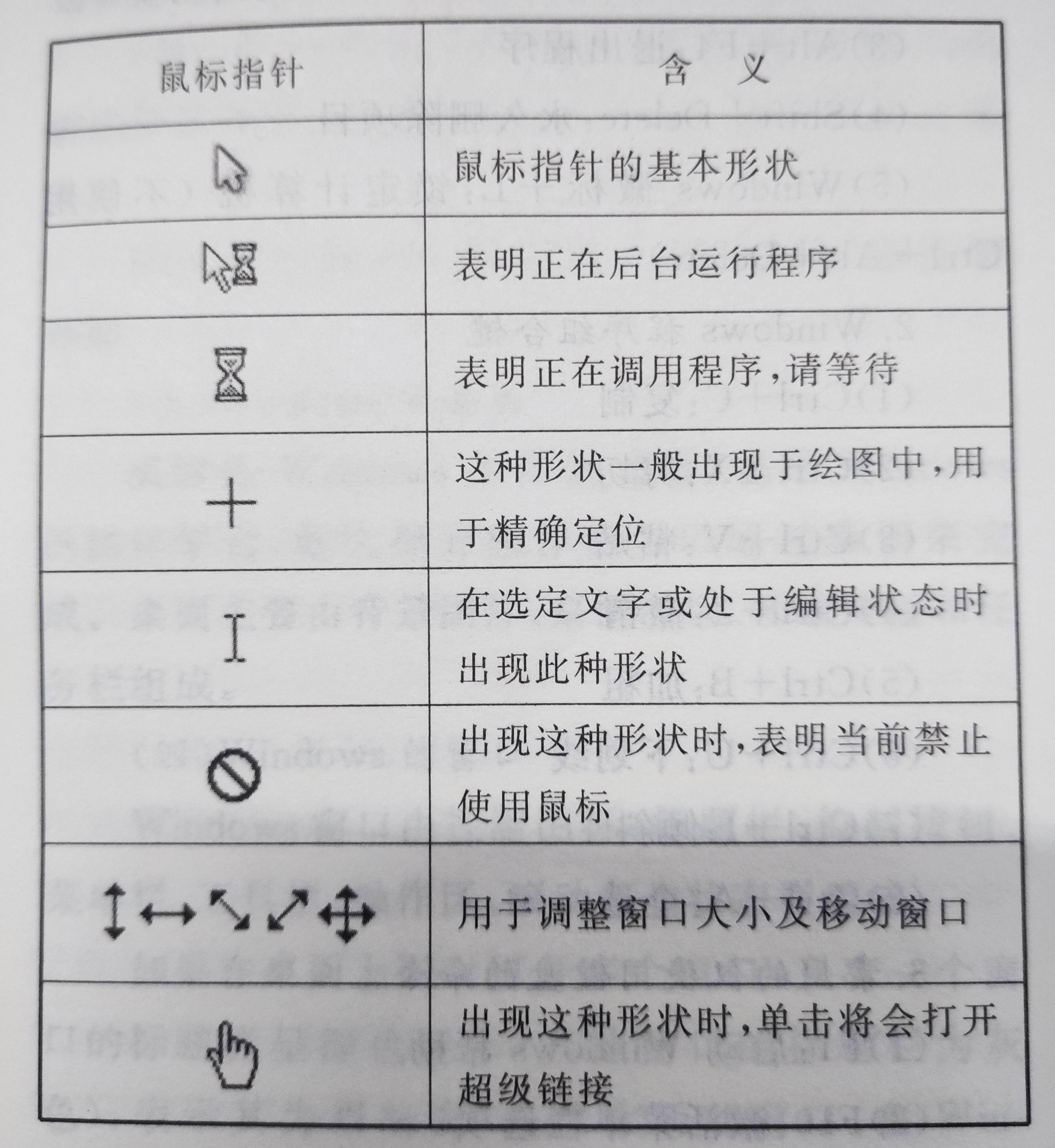 (一)多媒体技术的特性 多媒体技术具有以下5个特性:同步性、集成性、交互性、数字化和实时性。 (二)分辨率和色彩深度 图像由像素点组成,影响图像质量的因素主要包括分辨率和颜色深度。分辨率表示图像中像素点的密度,单位是dpi(Dot Per Inch),表示每英寸长度上像素点的数量。图像分辨率越高,包含的像素越多,表现细节就越清楚。 色彩深度决定图像最多可有的颜色数量,色彩深度以位(bit)表示,8位色彩深度的图像,其最多的颜色数量是28, (三)色彩模式 在数字图像中经常使用的是RGB和CMYK两种。RGB色彩模式的图像中,其所有颜色均由红®、绿(G)、蓝(B)3种基本色混合而成,由于红、绿、蓝是光的三原色,,所以该模式的图像适合于在在CMYK的图计算机屏幕这种发光媒介上显示。使中,所有颜色均由青©品红(M)、黄(Y)、黑(K)4种颜色混合而成,这4种颜色正是印刷中使用的4种颜料色,所以CMYK的图像适合于需要印刷的图像制作。 (四)图形图像的文件格式 图形图像的文件格式主要有以下几种: BMP、GIF、JPEG、PSD、DIB、PCP、DIF、WMF、TIF、EPS。其中GIF格式图片可以像动画一样放映,JPEG为有损压缩真彩图像格式,这两种图像应用最广。营(五)声音和视频基础知识 1.采样、量化和编码 采样指每隔一个时间间隔在声音的波形上截取一个振幅值,把时间上的连续信号变成时间上的离散信号。该时间间隔T称为采样周期,其倒数1/T称为采样频率。 采样频率越高,采样的间隔时间越短,在单位时间内计算机得到的声音样本数据就越多,对声音波形的表示也越精确,声音的质量就越好,声音文件占用的存储空间也越大。 量化指把在幅度上连续取值的每一个样本转换为离散值表示,就是将采样得到的声波上的幅度值数字化。量化的过程是先将采样后的信号按整个声波的幅度划分成有限个区段的集合,把落人某个区段内的采样值归为一类,并赋予相同的量化值。 编码指按照一 定的格式把经过采样和量化得到的离散数据记录下来,并在有效的数据中加人一些用于纠错、同步和控制的数据。 2.声音在计算机中的存储格式 3,视频文件格式 操作系统就是为了实现对计算机系统的硬件资源及软件资源进行控制和有效的管理,合理地组织计算机工作流程,以充分发挥计算机系统的工作效率和方便用户充分面有效地使用计算机资源而配置的一种系统软件。 (一)操作系统的基本特征 (1)程序并发性。 (二)操作系统的基本功能 (1)处理器的控制与管理。 (2)内存的分配与管理。 (3)外部设备的控制和管理。 (4)文件的控制和管理。 (5)作业的控制和管理。 (三)操作系统的分类 (1)批处理操作系统。 (2)分时操作系统。 (3)实时操作系统。 (4)单用户操作系统。 (5)网络操作系统。 (一)文件的命名规则 鼠标的基本操作有5种,分别是指向、单击、双击、拖动、右击。 鼠标指针的不同形状代表了不同的含义,具体内容如表4所示。 (1)文件名-般由文件名和扩展名两部分组成、文件名和扩展名之间用小圆点隔开。一个文件可以只有文件名没有扩展名,但是不能没有文件名。 (2)文件名由最长不超过255个合法的字符组成,扩展名由1~4个合法字符组成。 (3)文件名中可以使用大写和小写的英文字母,但系统对大小写字母按一样的字母对待,不进行区分。 (4)同一个文件夹内不能有相同的文件名。 (5)文件名可以使用空格和圆点,但不能使用如下字符 : / : % ? “ < > (二)文件的类型 来文件类型可以是应用程序、文本,也可以是声音、图像等,如程序文件(. com… exe.、. bat),文本文件(. txt)、声音文件(. wav、. mp3)、图像文件(.bmp… ipg)、字体文件(. fon)、Word文档(. doc)等。区别一个文件的类型有以下两种方法:一种是根据文件的扩展名,另一种是根据文件的图标。 (三)文件的属性 文件和文件夹的属性包括“只读”、“隐藏”、“系统”和“存档”四种。 (四)删除和恢复文件或文件夹 1.删除 选定要删除的文件或文件夹后,按下Delete键、删除的文件或文件夹就放到了回收站。如果不小心误删除了文件或文件夹,可以利用“回收站”来恢复被误删除的文件或文件夹。按下Shift+ Delete键可以物理删除文件或文件夹。 2.恢复 双击“回收站”图标,打开“回收站”窗口,选定要还原的文件或文件夹,执行“文件”“还原”菜单命令(或单击右键在弹出的快捷菜单中选择“还原”命令),选定的文件或文件夹就被恢复到原来的位置。 (一)鼠标的基本操作 鼠标的基本操作有5种,分别是:指向、单击、双击、拖动、右击。 鼠标指针的不同形状代表了不同的含义,具体内容如图 Windows系统组合键 (1)Ctrl+ Ese:打开“开始”菜单 (2)AIt+Tab;在打开的多个程序之间切换 (3)AIt+F4:退出程序 (4)Shift+ Delete:永久删除项目 (5)Windows微标+L:锁定计算机(不使用Ctrl+ Alt+ Delete)由31甲赤 Windows程序组合键 (1)Ctrl+C:复制 (2)Ctrl+X:剪切 (3)Ctrl+V:粘贴 (4)Ctrl+Z:撒销 (5)Ctrl+ B:加粗 (6)CtrI+U:下划线 (7)Ctrl+ I:倾斜 (8)Ctrl+A:全选 3.常用的仅使用键盘的命令 (1)F1:启动Windows帮助 (2)F10,激活菜单栏选项 (3)Shift+ F10:打开对应于选定项目的快捷菜单(这与右键单击对象等效) (4)Ctrl+ Esc;打开“开始”菜单(使用箭头键可选择项目) (5)Ctrl+ Esc或Esc:选择“开始”按钮(按TAB键选择任务栏,或者按Shift+F10 显示上下文菜单) (6)Ctrl + Shift+ Esc:打开Windows任务管理器 (三)Windows的桌面 桌面是Windows}工作的背景,也是Windows的操作平台,绝