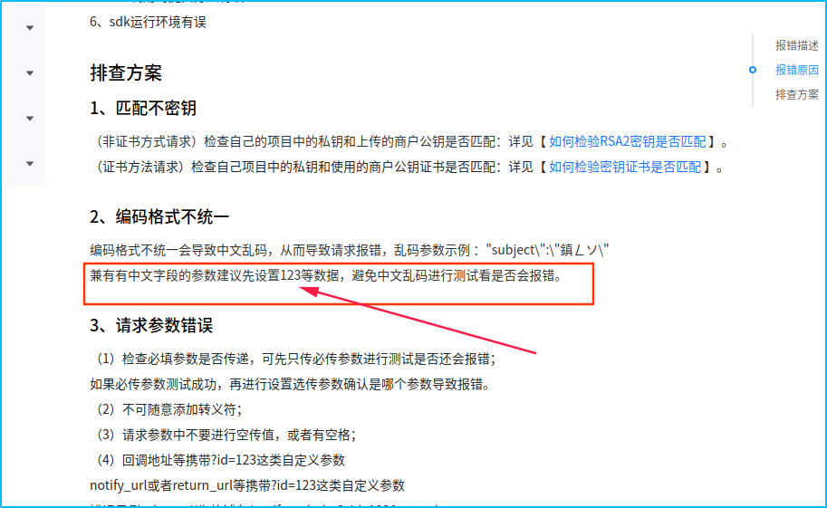 直接看错误: 整了将近2个小时。最终在官网找到了错误的原因。 关于此类报错,可以根据本文档详细排查下: 报错原因,有一下几种,可以慢慢的,仔细的从头到尾排查一遍。 1、密钥不匹配 2、编码格式不统一 3、请求参数数据有误 4、接口调用加签方式和应用上选择的加签方式不对应 5、sdk调用的提交方法有误 6、sdk运行环境有误 当我排查到第二步编码的时候 发现真的是编码的问题