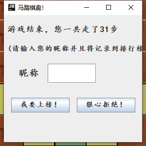 (1)设计内容:设计一个马踏棋盘游戏,马作为棋子,以马走日字的走法,将整个棋盘一次性走完,走过的位置不能再走 此链接是我上个博客对该项目数据结构的的详细讲解! 1.首先运行MainChess类然后点击开始游戏,通过一个过度界面会进入游戏界面。如下图 2.设置马的初始行和初始列,在界面中输入1到8的数字后点击吗初始行和马初始列四个字,才能确定设置初始位置。设置好之后点击开始游戏就会出现马。 项目主要分为以下七个包,其中Music是我想加进去音乐的但是,没有成功,有兴趣的大家可以自己去加。 我将源代码上传到github上了,大家可以自行去下载,不懂github的大家也可以趁早去学习,现在很多人都会用到。马踏棋盘游戏小项目