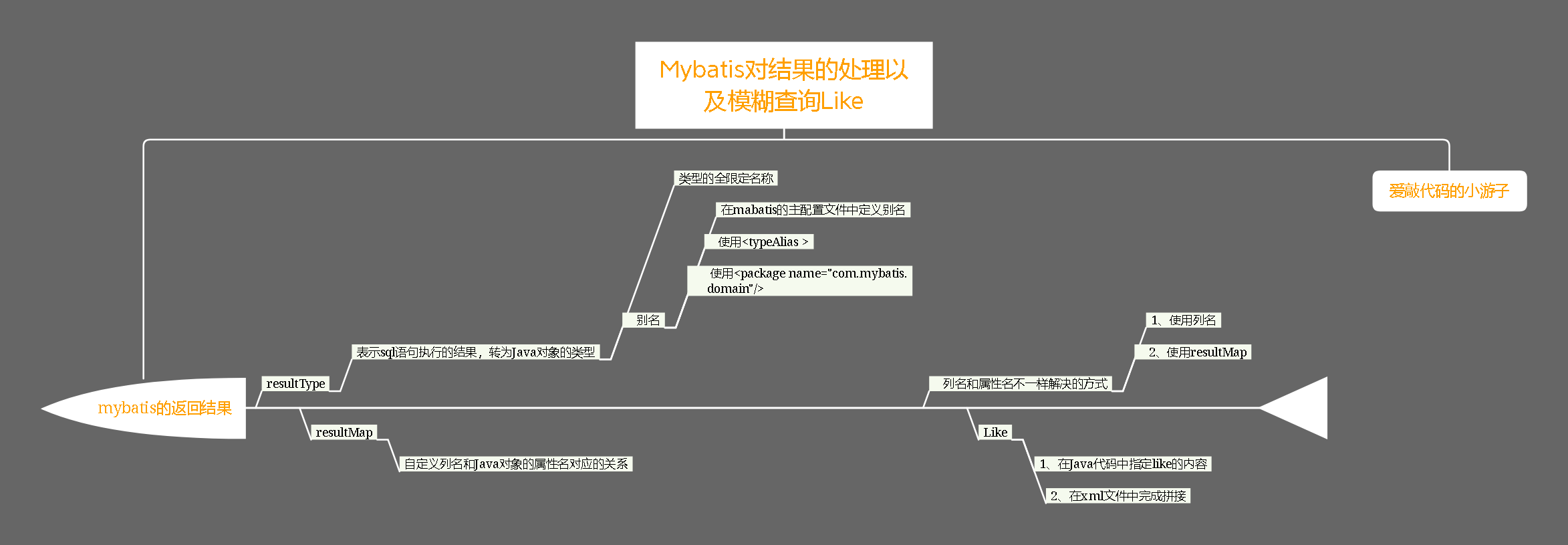 表示sql语句执行的结果,转为Java对象的类型 1)起别名 (mybatis规定好的别名) java简单类型别名对照表: 2)全限定名称; 推荐全限定名称 3)**自定义的类型,**定义类型使用别名(推荐全限定名称): sql映射文件: 处理方式: 用jdbc:的实现 1、你自定义列值赋值给哪个属性 resultType使用map时 默认赋值给同名的属性 resultMap可以自定义赋值 2、 定义redultMap 3、 列名和Java属性的关系 2、当列名和属性名不一样时,解决方案 使用resultMap sql语句中使用别名 1、在Java代码中指定like的内容