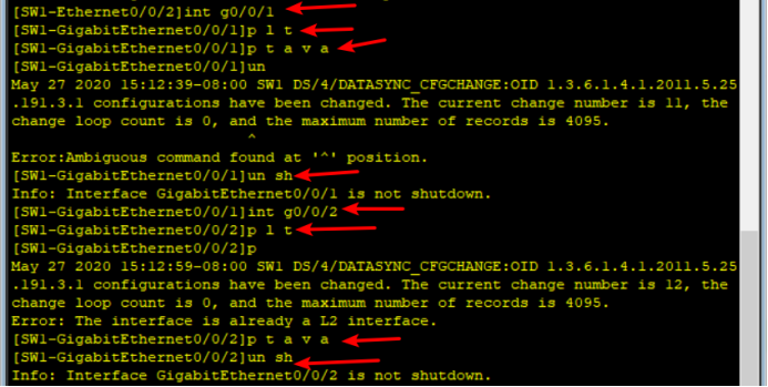 再进入g0/0/1的子接口g0/0/1.100和g0/0/1.200,配置相应的单臂路由