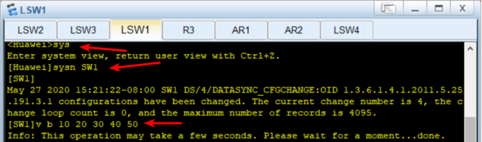 进入三层交换机的虚拟接口vlanif 10 20 30 40 50,配IP地址做为下面设备的网关