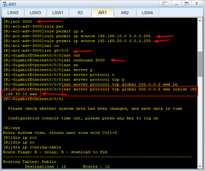 nat outbound 3000 ###配置地址转换:将acl3000与接口关联,并在出方向上应用NAT