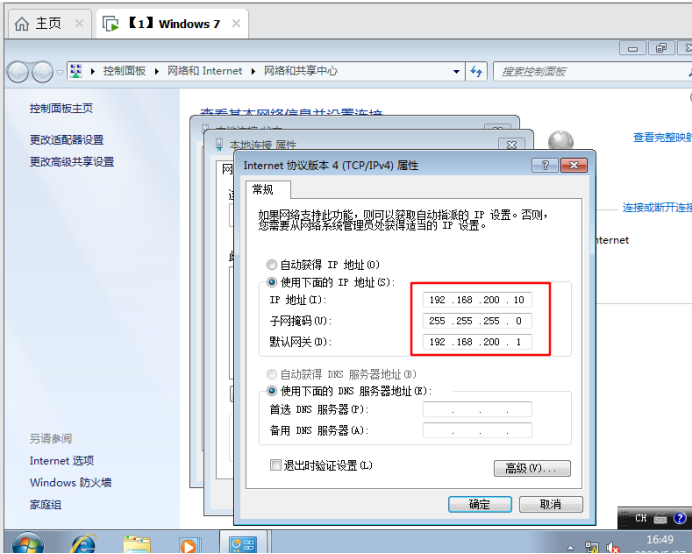 开启Windows 7虚拟机,配置IP地址、子网掩码、网关
