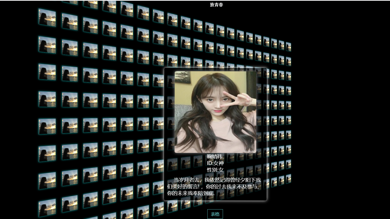 sphere.html<!DOCTYPE html> <html> <head> <title>致青春</title> <meta charset="utf-8"> <meta name="viewport" content="width=device-width, user-scalable=no, minimum-scale=1.0, maximum-scale=1.0"> <link rel="stylesheet" href="css/index.css"> <link rel="stylesheet" href="css/animate.min.css"> </head> <body> <script src="js/table.js"></script> <script src="js/jquery.min.js"></script> <script src="js/three.js"></script> <script src="js/tween.min.js"></script> <script src="js/TrackballControls.js"></script> <script src="js/CSS3DRenderer.js"></script> <div id="container"></div> <div id="info">致青春</div> <div id="menu"> <button id="table">表格</button> </div> <div class="show_info animated" style="display:none;"> <div class="info_my"> <img src="img/cc.png" /> <div class="info_mem"> <div class="nickname">鞠婧祎</div> <div class="id">ID:女神</div> <div class="vote">性别:女</div> </div> </div> <div class="intro">当岁月老去,我依然记得曾经夕阳下我们美好的誓言! ,你的过去我来不及参与,你的未来我奉陪到底.</div> </div> <script> var personArray = new Array; var CurPersonNum = 0; // animate var _in = ['bounceIn','bounceInDown','bounceInLeft','bounceInRight','bounceInUp','fadeIn','fadeInDown','fadeInDownBig','fadeInLeft','fadeInLeftBig','fadeInRight','fadeInRightBig','fadeInUp','fadeInUpBig','rotateIn','rotateInDownLeft','rotateInDownRight','rotateInUpLeft','rotateInUpRight','slideInDown','slideInLeft','slideInRight']; var _out = ['bounceOut','bounceOutDown','bounceOutLeft','bounceOutRight','bounceOutUp','fadeOut','fadeOutDown','fadeOutDownBig','fadeOutLeft','fadeOutLeftBig','fadeOutRight','fadeOutRightBig','fadeOutUp','fadeOutUpBig','rotateOut','rotateOutDownLeft','rotateOutDownRight','rotateOutUpLeft','rotateOutUpRight','slideOutDown','slideOutLeft','slideOutRight']; // 模拟推送数据 var s = setInterval(function(){ // get animate var rand_in = parseInt(Math.random() * _in.length,10); var rand_out = parseInt(Math.random() * _out.length,10); if(CurPersonNum >= personArray.length){ CurPersonNum = 0; } $('.show_info').show(); $('.show_info').addClass(_in[rand_in]); setTimeout(function(){ $('.show_info').removeClass(_in[rand_in]); // 更改展示的图片 var img = document.getElementsByClassName('element')[CurPersonNum].getElementsByTagName('img')[0]; img.setAttribute('src','img/aa.png'); ++CurPersonNum; setTimeout(function(){ $('.show_info').addClass(_out[rand_out]); setTimeout(function(){ $('.show_info').removeClass(_out[rand_out]); $('.show_info').hide(); },1000); },1500); },1000); },4500); // 生成虚拟数据 for(var i=0;i<=199;i++){ personArray.push({ image: "img/aa.png" }); } var table = new Array; for (var i = 0; i < personArray.length; i++) { table[i] = new Object(); if (i < personArray.length) { table[i] = personArray[i]; table[i].src = personArray[i].thumb_image; } table[i].p_x = i % 20 + 1; table[i].p_y = Math.floor(i / 20) + 1; } var camera, scene, renderer; var controls; var objects = []; var targets = { table: [], sphere: [], helix: [], grid: [] }; init(); animate(); function init() { camera = new THREE.PerspectiveCamera( 40, window.innerWidth / window.innerHeight, 1, 10000 ); camera.position.z = 3000; scene = new THREE.Scene(); // table for ( var i = 0; i < table.length; i ++ ) { var element = document.createElement( 'div' ); element.className = 'element'; element.style.backgroundColor = 'rgba(0,127,127,' + ( Math.random() * 0.5 + 0.25 ) + ')'; var img = document.createElement('img'); img.src = table[ i ].image; element.appendChild( img ); var object = new THREE.CSS3DObject( element ); object.position.x = Math.random() * 4000 - 2000; object.position.y = Math.random() * 4000 - 2000; object.position.z = Math.random() * 4000 - 2000; scene.add( object ); objects.push( object ); // 表格需要坐标进行排序的 var object = new THREE.Object3D(); object.position.x = ( table[ i ].p_x * 140 ) - 1330; object.position.y = - ( table[ i ].p_y * 180 ) + 990; targets.table.push( object ); } //渲染 renderer = new THREE.CSS3DRenderer(); renderer.setSize( window.innerWidth, window.innerHeight ); renderer.domElement.style.position = 'absolute'; document.getElementById( 'container' ).appendChild( renderer.domElement ); // 鼠标控制 controls = new THREE.TrackballControls( camera, renderer.domElement ); controls.rotateSpeed = 0.5; controls.minDistance = 500; controls.maxDistance = 6000; controls.addEventListener( 'change', render ); var button = document.getElementById( 'table' ); button.addEventListener( 'click', function ( event ) { transform( targets.table, 1000 ); }, false ); transform( targets.table, 2000 ); // window.addEventListener( 'resize', onWindowResize, false ); } function transform( targets, duration ) { TWEEN.removeAll(); for ( var i = 0; i < objects.length; i ++ ) { var object = objects[ i ]; var target = targets[ i ]; new TWEEN.Tween( object.position ) .to( { x: target.position.x, y: target.position.y, z: target.position.z }, Math.random() * duration + duration ) .easing( TWEEN.Easing.Exponential.InOut ) .start(); new TWEEN.Tween( object.rotation ) .to( { x: target.rotation.x, y: target.rotation.y, z: target.rotation.z }, Math.random() * duration + duration ) .easing( TWEEN.Easing.Exponential.InOut ) .start(); } new TWEEN.Tween( this ) .to( {}, duration * 2 ) .onUpdate( render ) .start(); } function onWindowResize() { camera.aspect = window.innerWidth / window.innerHeight; camera.updateProjectionMatrix(); renderer.setSize( window.innerWidth, window.innerHeight ); render(); } function animate() { // 让场景通过x轴或者y轴旋转 & z // scene.rotation.x += 0.011; scene.rotation.y += 0.008; requestAnimationFrame( animate ); TWEEN.update(); controls.update(); // 渲染循环 render(); } function render() { renderer.render( scene, camera ); } </script> </body> </html>