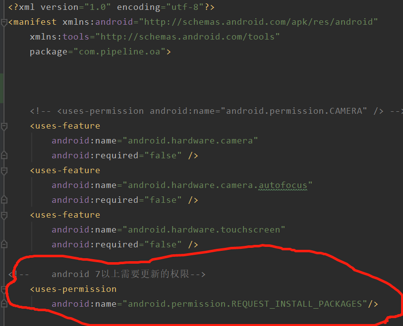 1.拉下代码进行测试发现,会报file:xxxxx的错误 `<provider android:name="android.support.v4.content.FileProvider" android:authorities="${applicationId}.fileProvider" android:exported="false" android:grantUriPermissions="true"> <meta-data android:name="android.support.FILE_PROVIDER_PATHS" android:resource="@xml/provider_paths"/> </provider>` 然后在这个文件里面添加一个权限:` <!-- android 7以上需要更新的权限 --> <uses-permission android:name="android.permission.REQUEST_INSTALL_PACKAGES"/>` <!-- ps:一定要注意位置,如果报红就是你的位置不对直接放在文件最上面的位置,这里是我踩的坑 --> `<paths xmlns:android="https://schemas.android.com/apk/res/android"> <root-path name="root_path" path="." /> <external-path name="Android/data/com.pipeline.oa" path="."/> <external-path path="." name="external_storage_root"/> </paths>`