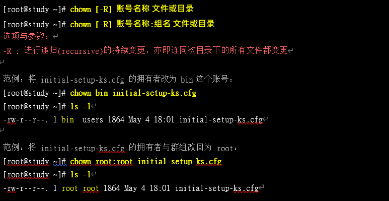 其实一个文件的属性与权限有很多!先介绍几个常用于群组、拥有者、各种身份的权限之修改的指令,如下所示: 改变一个文件的群组真是很简单的,直接以 chgrp 来改变即可,这个指令是 change group 的缩写!要被改变的组名必须要在/etc/group 文件内存在才行,否则就会显示错误!假设你已经是 root 的身份了,那么在你的家(home)目录内有一个名为 initial-setup-ks.cfg 的文件, 如何将该文件的群组改变一下呢?假设你已经知道在/etc/group 里面已经存在一个名为 users 的群组, 但是testing 这个群组名字就不存在/etc/group 当中了,此时改变群组成为 users 与 testing 分别会有什么现象发生呢? 发现了吗?文件的群组被改成 users 了,但是要改成 testing 的时候, 就会发生错误~注意喔!发生错误讯息还是要努力的查一查错误讯息的内容才好! 将他英文翻译成为中文,就知道问题出在哪里了。 既然改变群组是 change group,那么改变拥有者就是 change owner 啰!BINGO!那就是 chown 这个指令的用途,要注意的是, 用户必须是已经存在系统中的账号,也就是在/etc/passwd 这个文件中有纪录的用户名称才能改变。chown 的用途还满多的,他还可以顺便直接修改群组的名称呢!此外,如果要连目录下的所有次目录或文件同时更改文件拥有者的话,直接加上 -R 的选项即可!我们来看看语法与范例: 注意:事实上,chown 也可以使用『chown user.group file』,亦即在拥有者与群组间加上小数点『 . 』也行! 不过很多朋友设定账号时,喜欢在账号当中加入小数点(例如 vbird.tsai 这样的账号格式),这就会造成系统的误判了! 所以我们比较建议使用冒号『:』来隔开拥有者与群组啦!此外,chown 也能单纯的修改所属群组呢! 例如『chown .sshd initial-setup-ks.cfg』就是修改群组~看到了吗?就是那个小数点的用途! 知道如何改变文件的群组与拥有者了,那么什么时候要使用 chown 或 chgrp 呢?或许你会觉得奇怪吧? 是的,确实有时候需要变更文件的拥有者的,最常见的例子就是在复制文件给你之外的其他人时, 我们使用最简单的 cp 指令来说明好了: 假设你今天要将.bashrc 这个文件拷贝成为.bashrc_test 档名,且是要给 bin 这个人,你可以这样做: 由于复制行为(cp)会复制执行者的属性与权限,所以!怎么办?.bashrc_test 还是属于 root 所拥有, 如此一来,即使你将文件拿给 bin 这个使用者了,那他仍然无法修改的, 所以你就必须要将这个文件的拥有者与群组修改一下啰!知道如何修改了吧? 文件权限的改变使用的是 chmod 这个指令,但是,权限的设定方法有两种, 分别可以使用数字或者是符号来进行权限的变更。我们就来谈一谈: 1、数字类型改变文件权限 Linux 文件的基本权限有九个,分别是 owner/group/others 三种身份各有自己的read/write/execute 权限,先复习一下上面提到的数据:文件的权限字符为:『-rwxrwxrwx』, 这九个权限是三个三个一组的!可使用数字来代表各个权限,各权限的分数对照表如下: r:4、w:2、x:1 每种身份(owner/group/others)各自的三个权限(r/w/x)分数是需要累加的,例如当权限为: [-rwxrwx—] 分数则是: 所以等一下我们设定权限的变更时,该文件的权限数字就是 770 啦!变更权限的指令 chmod 的语法是这样的: 举例来说,如果要将.bashrc 这个文件所有的权限都设定启用,那么就下达: 那如果要将权限变成『 -rwxr-xr– 』呢?那么权限的分数就成为 [4+2+1][4+0+1][4+0+0]=754 啰!所以你需要下达『 chmod 754 filename』。 另外,在实际的系统运作中最常发生的一个问题就是,常常我们以 vim 编辑一个 shell 的文字批处理文件后,他的权限通常是 -rw-rw-r– 也就是 664, 如果要将该文件变成可执行文件,并且不要让其他人修改此一文件的话, 那么就需要-rwxr-xr-x 这样的权限,此时就得要下达:『 chmod 755 test.sh 』的指令啰!另外,如果有些文件你不希望被其他人看到,那么应该将文件的权限设定为例如:『-rwxr—— 』,那就下达『 chmod 740 filename 』吧! 例题:将刚刚你的.bashrc 这个文件的权限修改回-rw-r–r–的情况吧! 答:-rw-r–r–的分数是 644,所以指令为: chmod 644 .bashrc 2、符号类型改变文件权限 还有一个改变权限的方法呦!从之前的介绍中我们可以发现,基本上就九个权限分别是(1)user (2)group (3)others 三种身份啦!那么我们就可以由 u, g, o 来代表三种身份的权限!此外, a 则代表 all 亦即全部的身份!那么读写的权限就可以写成 r, w, x 啰!也就是可以使用底下的方式来看: 来实作一下吧!假如我们要『设定』一个文件的权限成为『-rwxr-xr-x』时,基本上就是: 所以就是: 那么假如是『 -rwxr-xr– 』这样的权限呢?可以使用『 chmod u=rwx,g=rx,o=r filename 』来设定。此外,如果我不知道原先的文件属性,而我只想要增加.bashrc 这个文件的每个人均可写入的权限, 那么我就可以使用: 而如果是要将权限去掉而不更动其他已存在的权限呢?例如要拿掉全部人的可执行权限,则: 知道 +, -, = 的不同点了吗?对啦!+ 与 – 的状态下,只要是没有指定到的项目,则该权限『不会被变动』, 例如上面的例子中,由于仅以 – 拿掉 x 则其他两个保持当时的值不变!多多实作一下,你就会知道如何改变权限啰! 这在某些情况底下很好用的~举例来说,你想要教一个朋友如何让一个程序可以拥有执行的权限, 但你又不知道该文件原本的权限为何,此时,利用『chmod a+x filename』 ,就可以让该程序拥有执行的权限了。是否很方便?
