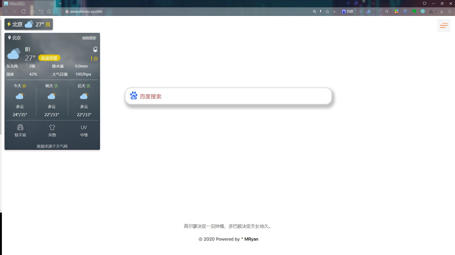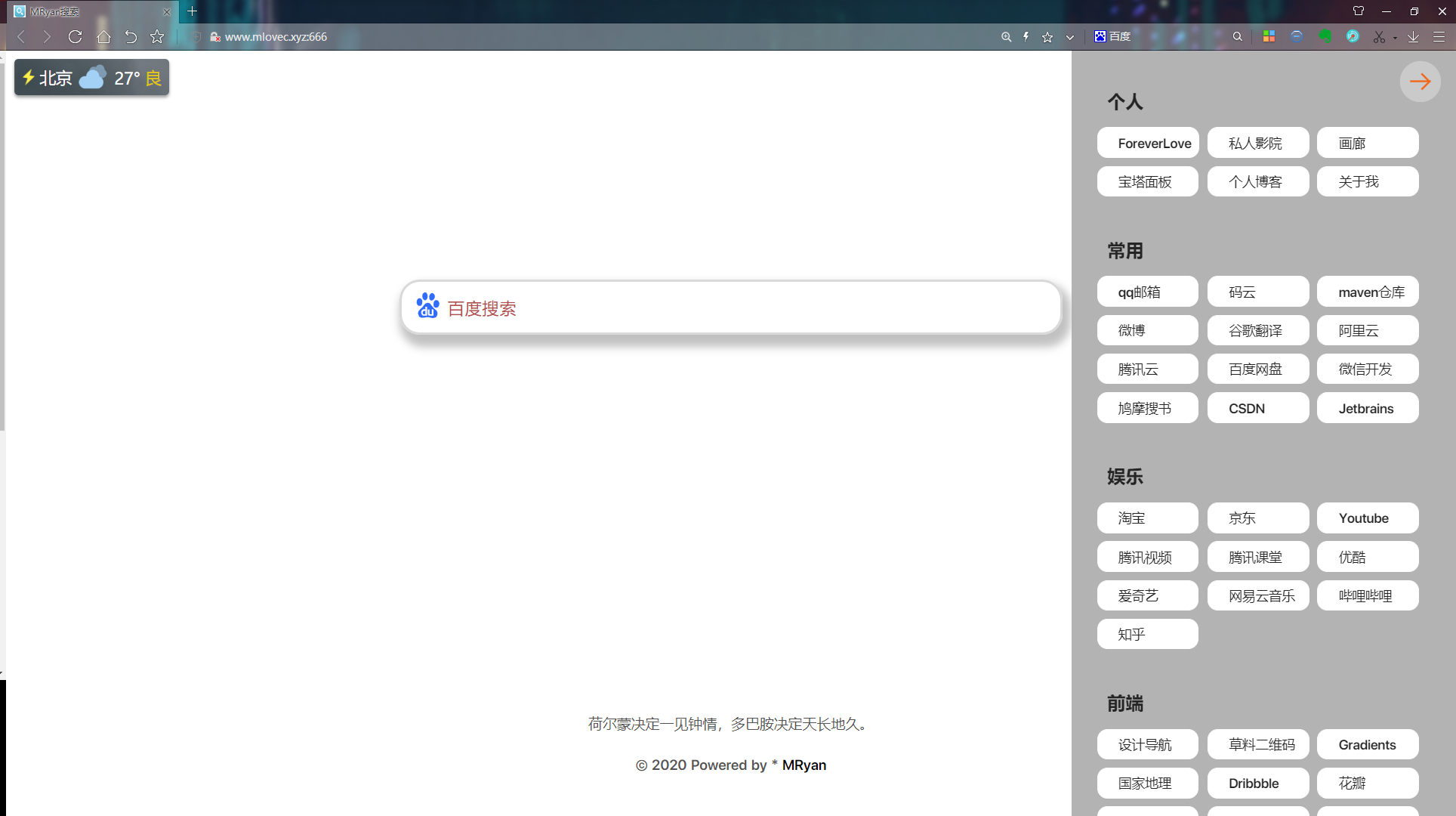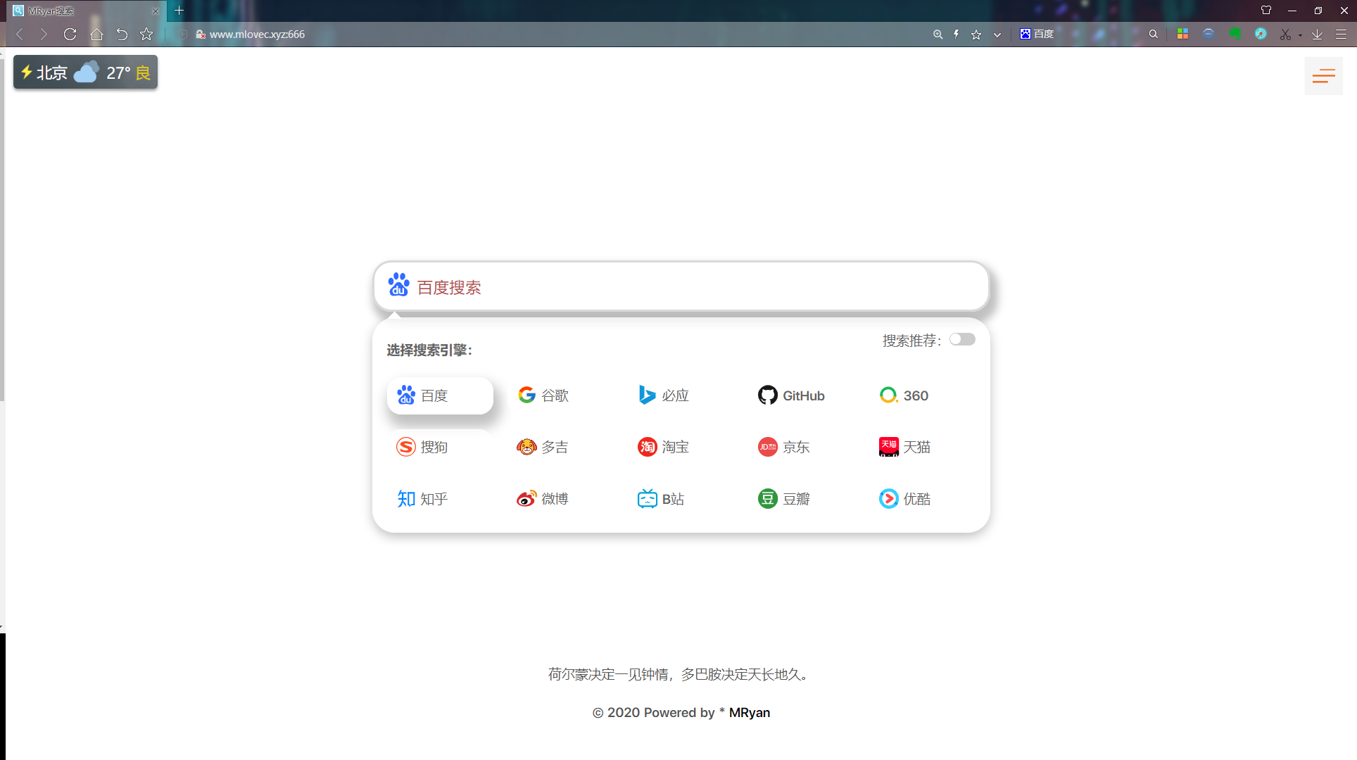 面向搜索引擎编程工具 面向搜索引擎编程那是个玩笑话。 话不多说 看了项目截图你就知道这是个什么工具了。 一个搜索页面,可以设置成浏览器默认主页 自定义夹 多种搜索方式 可自定义背景 适配多端: 直接使用: 如果你嫌麻烦可以直接访问我的地址 将网页设置为主页 自定义: 或者先给个star,然后clone项目 你完全可以自定制成自己想要的样子 当然是我作为一个很菜的程序员的编程之旅。夹太多 而网络夹有浏览器限制,主页广告相当多。那怎么能又美观又使用,于是MySerach出现了。 身为一个后端开发小菜菜,借鉴了网上大神的css设计,在此表示感谢。 仅供学术交流,便于自己便于大家。 如果觉得好用,请给个Star 项目地址:项目链接