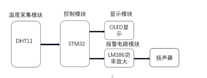(3)当stm32判断出当前温度已经超出阈值时,将信号传输给LM386功率放大器,之后功率放大器驱动扬声器发出声音。