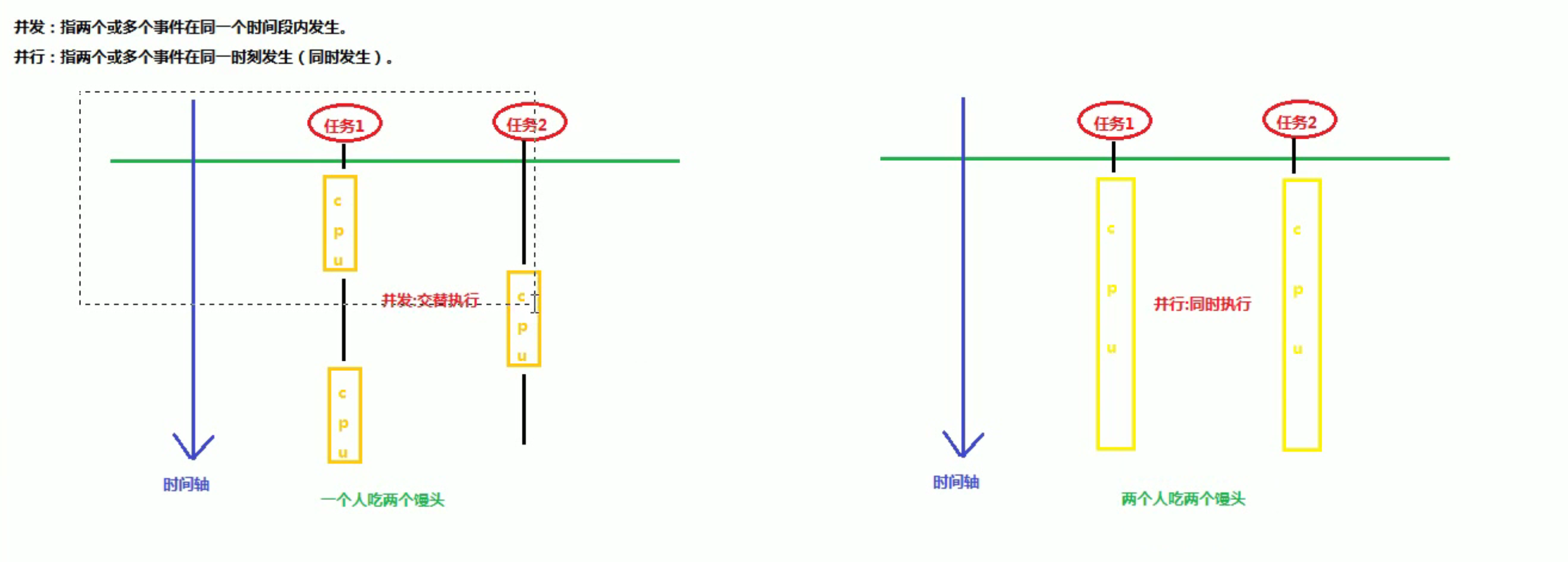 并行:指两个或多个事件在同一时刻发生(同时发生)。