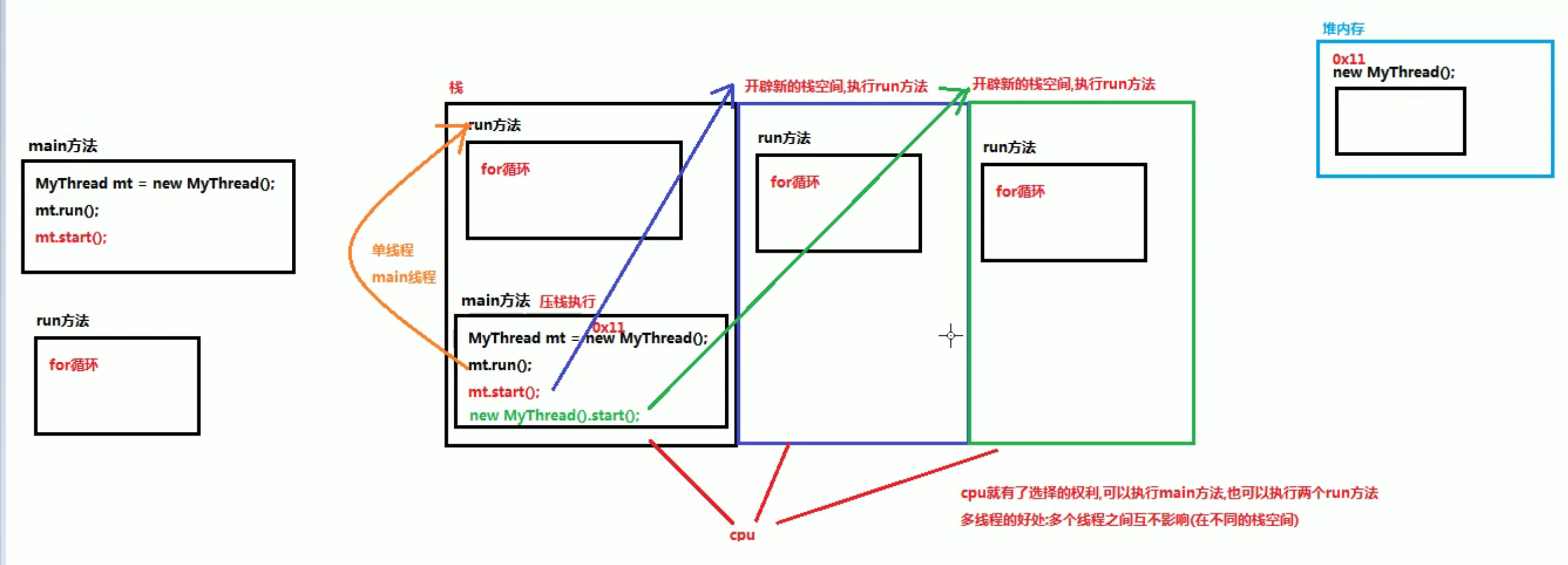 多线程package cn.itcast.day12.demo02; //1. 创建一个Thread类的子类 public class MyThread extends Thread { //2. 在Thread类的子类中重写Thread类中的方法,设置线程任务(开启线程要做什么) @Override public void run(){ for (int i = 0; i < 10; i++){ System.out.println("run: " + i); } } } package cn.itcast.day12.demo02; public class MulThread { public static void main(String[] args) { //3. 创建Thread类的子类对象 MyThread mt = new MyThread(); //4. 调用Thread类中的方法start,开启新的线程,执行run方法 mt.start(); for(int i = 0; i < 10; i++){ System.out.println("main :" + i); } } } run: 0 main :0 run: 1 main :1 run: 2 main :2 run: 3 main :3 run: 4 main :4 run: 5 main :5 run: 6 main :6 run: 7 run: 8 run: 9 main :7 main :8 main :9 3.3 多线程的原理