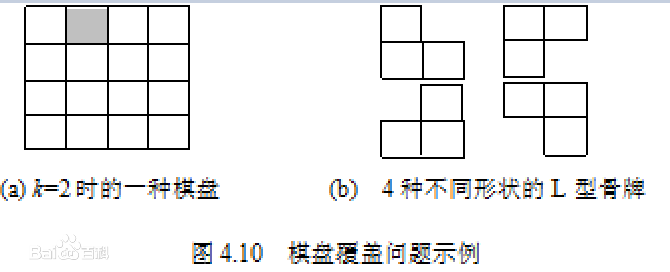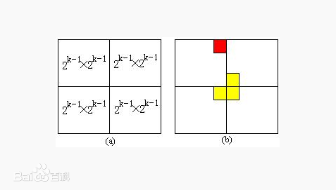 今天复习了一下很久很久前学过的分治和递归算法思想。 分治顾名思义分而治之,当面对一个规模比较大的问题时,暴力解决问题则会面临庞大的计算量,因此并不妥当,我们可以把一个大的问题转换为规模相同的子问题,通过调用解决子问题的算法来解决整个问题。 在我看来递归并不是一种算法而是解决问题的一种思想,最常见的递归计算就是计算n!和斐波那契数列,递归的特点就是代码实现起来比较快捷,短短的几行代码就可以计算解决斐波那契数列问题。而非递归的方式则要实现一个很复杂很复杂的函数。 今天解决的问题就是棋盘覆盖问题。问题描述:在一个2^k*2^k的方格组成的一个棋盘上,恰有一个方格与其他方格不同,称之为特殊方格,显然特殊方格出现的概率有4^种情况,图例中的(a)是k=2中的一种情况,棋盘覆盖问题要求用(b)中的四种L型骨牌覆盖满给定棋盘上除特殊方格以外的所有方格,且要求任何两个骨牌不能重叠覆盖。 (本图源自百度百科) 运用分治策略时,可以将棋盘分为4个2^k-1*2^k-1个子棋盘,特殊方格一定在子棋盘其中之一,其余三个棋盘中无特殊方格,可以进一步在这三个子棋盘的汇合处添加一个L骨牌将这三个子棋盘转换为规模相同的有一个特殊方格的子棋盘,再进行递归的分割,直至棋盘为1*1为止。 (图片源自百度百科) 用C++实现代码如下 代码测试效果图: 整个算法的时间复杂度也是显而易见的, T(K)=1 (K=0) T(K)=4T(K-1) 可得T(K)=O(4^K)。 总而言之,棋盘覆盖算法属于比较简单而且比较经典的递归分治算法,比较适用于刚接触这种算法思想的人去写一写尝试一下。而递归分治更多的用在排序问题上,比如快排和合并排序,能够在一定程度上优化问题解决的时间复杂度。