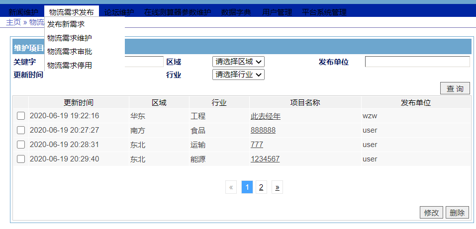 点击上方菜单栏的物流需求发布的下拉菜单找到自己需要进行的功能。