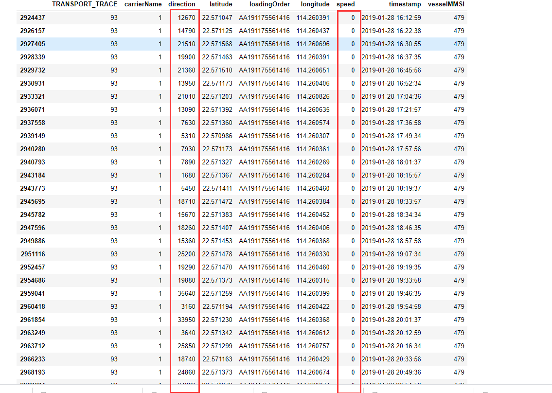 1、首先题目是要我们预测到港时间,那么怎样才算到港呢,这里我们截取了一个订单的最后几条记录,发现船的经纬度已经不在发生什么改变,speed也是0的状态,但是该订单仍然在记录,并且方向在不断改变,从这里结合实际情况我们能猜想到,该运单船只应该是遇到了塞港,导致需要不断变换方向,缓慢移动到目的地。但是根据官方的说明,其实这已经算是到港了。我们观察到这前后的时间差长达4个小时之久,那么如果我们取记录的最后一条log作为到港时间,就显的不太合理,这会与官方给的时间上有比较大的误差。所以在制作label的方面,我们可以考虑通过行船的状态比度speed为0,或者经纬度不在剧烈改变,或者距离目标港口一定距离等一系列方式,判断实际的到港。
