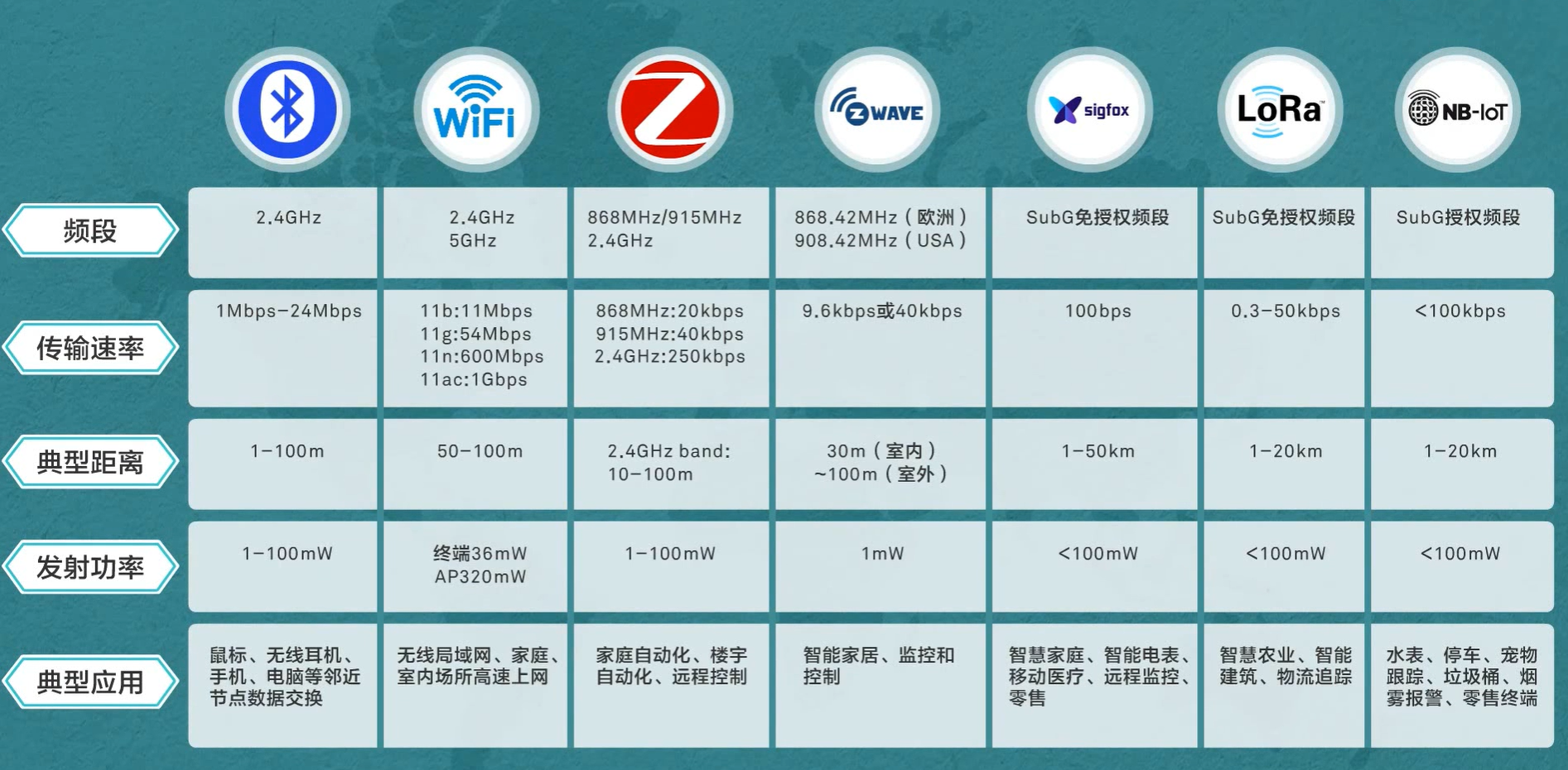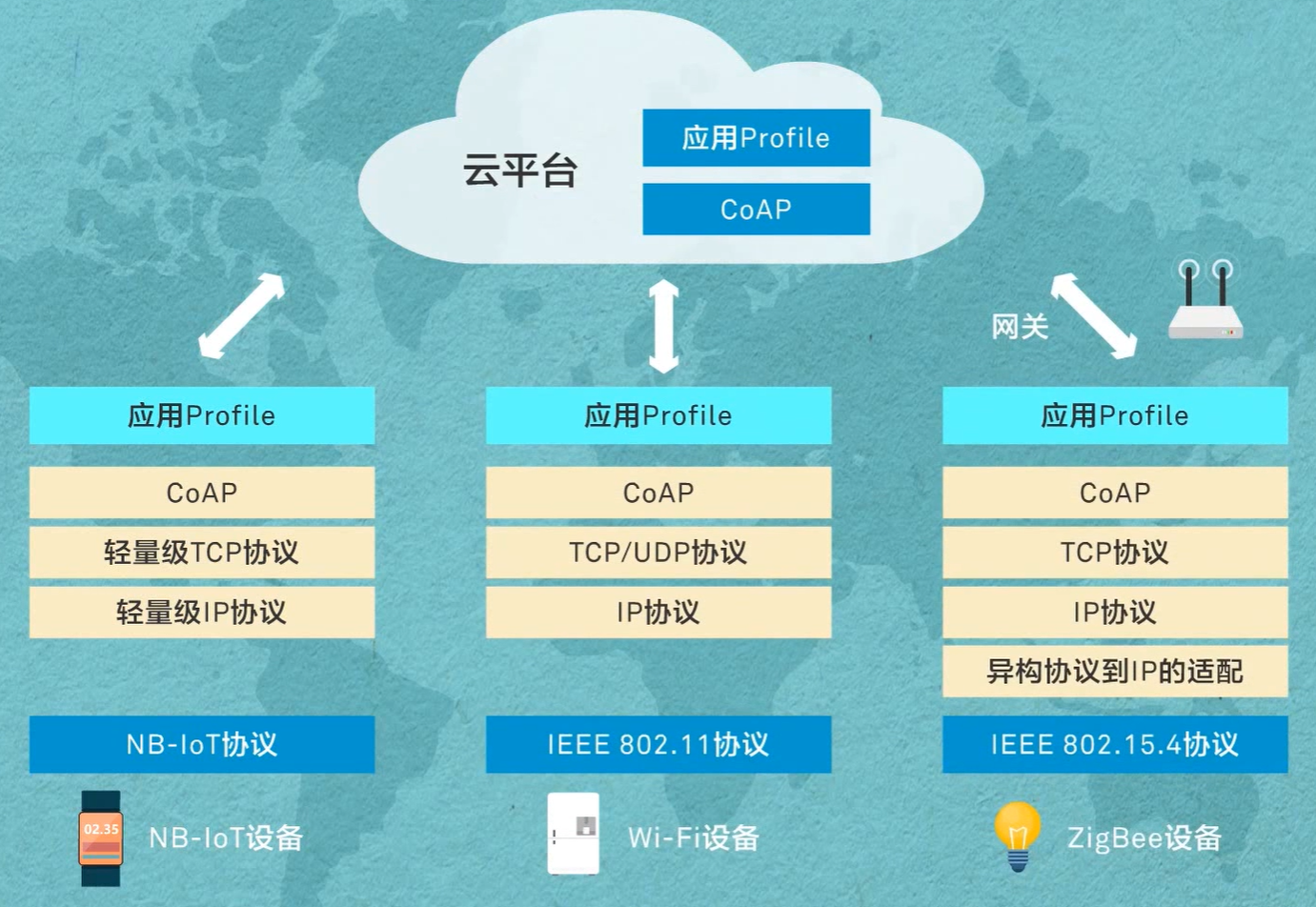 主要分为两类: 蓝牙:2.4-2.485GHz的ISM波段的无线电波、最高数据传输速率1Mbps、最大传输距离为10cm-10m的数据传输(通过增加发射传输功率传输距离可达到100m)。其优点是速率快、低功耗、安全性高,缺点是网络节点少,不适合多点布控。 Wi-Fi:Wi-Fi是一种允许电子设备连接到一个无线局域网(WLAN)的技术,通常使用2.4G UHF或5G SHF ISM射频频段。其优点是范围覆盖广,数据传输效率快,缺点是传输安全性不好,稳定性差,功耗略高。 ZigBee:ZigBee是基于IEEE802.15.4标准的低功耗局域网协议,广泛应用于工业,智慧家庭等中。其优点是近距离、低复杂度、自组织、低功耗、低数据速率,缺点是物体阻挡后信号会衰减、不同芯片兼容性较差、网络较灵活、不易维护。 Z-Wave:Z-Wave是一种新兴的基于射频的、低成本、低功耗、高可靠的短距离无线通信技术。其优点是网络结构简单、低功耗、低成本、可靠性高,缺点是速率较低,标准不开放,芯片不能通过Sigma Designs这唯一来源获取。 LPWA(Low Power Wide Area)低功率广域网 SigFox:Sigfox公司在全球部署低功耗广域网(LPWA),提供物联网(IoT)连接服务,用户设备集成支持Sigfox协议的射频模块或者芯片,开通连接服务后,即可连接到Sigfox网络。 LoRa:LoRa是semtech公司创建的低功耗局域网无线标准,我们知道,低功耗一般很难覆盖远距离,而远距离一般功耗高,LoRa的名字翻译就是远距离无线电(Long Range Radio),它最大特点就是在同样的功耗条件下比其他无线方式传播的距离更远,实现了低功耗和远距离的统一,它在同样的功耗下比传统的无线射频通信距离扩大3-5倍。 NB-IoT:窄带物联网(Narrow Band Internet of Things, NB-IoT)成为万物互联网络的一个重要分支。NB-IoT构建于蜂窝网络,只消耗大约180kHz的带宽,可直接部署于GSM网络、UMTS网络或LTE网络,以降低部署成本、实现平滑升级。 NB-IoT是IoT领域一个新兴的技术,支持低功耗设备在广域网的蜂窝数据连接,也被叫作低功耗广域网(LPWAN)。NB-IoT支持待机时间长、对网络连接要求较高设备的高效连接。据说NB-IoT设备电池寿命可以提高至少10年,同时还能提供非常全面的室内蜂窝数据连接覆盖。 IoT平台:终端接入解耦、能力开放两个作用。 OceanConnect是华为公司基于物联网、云计算、大数据等技术打造的开放式生态环境。 NB—>Narrow Band 表明NB-IoT是一项基于窄带的通信技术 工业物联网网关属于物联网架构中的网络层,负责下行汇聚、上行回传。工业物联网复杂度高,部署难。 过去的家庭网关为简单的点状网络