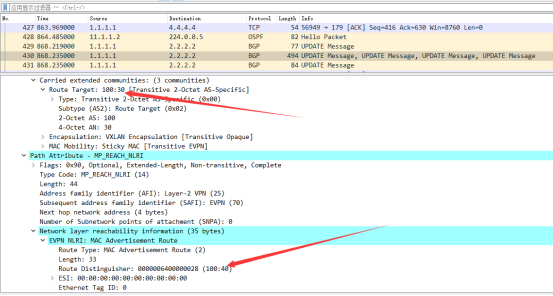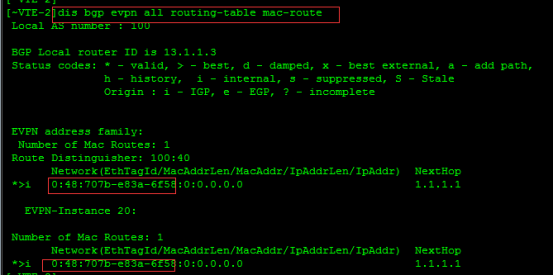 (2)EVP*的RD与RT自定义[*VTE-1]evp*-overlay enable //开启EVP*的承载功能 [*VTE-1]bridge-domain 10 //创建二层广播域,编号10 [*VTE-1-bd10]vxlan vni 10 //此广播域对应的VXLAN编号为10 [*VTE-1-bd10]evp* //进入此广播域的EVP*实例进程下 [*VTE-1-bd10-evp*]route-distinguisher 100:10 //配置此实例的RD为100:10(RD本地有效,在本地需要保持唯一,不能与本地的其他EVP*实例重复,与其他设备的可以重复) [*VTE-1-bd10-evp*]vp*-target 100:10 export-extcommunity //设置此EVP*实例发出时携带100:10的RT值 [*VTE-1-bd10-evp*]vp*-target 100:10 import-extcommunity //此EVP*实例只接收带有RT 100:10的EVP*地址簇的路由 [~VTE-1]int G1/0/1 [~VTE-1-GE1/0/1]undo shutdown //激活主接口 [*VTE-1]int GE 1/0/1.1 mode l2 //创建二层 子接口 [*VTE-1-GE1/0/1.1]bridge-domain 10 //此接口绑定本地广播域10 [*VTE-1-GE1/0/1.1]encapsulation dot1q vid 10 //只接收带有vlan 10便签的用户数据,同理发往用户的数据协议vlan 10的标签 [*VTE-1-GE1/0/1.1]quit [~VTE-1]bgp 100 [~VTE-1-bgp]l2vpn-family evp* //进入BGP的EVP*地址簇下激活邻居 [*VTE-1-bgp-af-evp*]peer 1.1.1.1 enable //激活本设备与1.1.1.1的EVP*邻居 [*VTE-1-bgp-af-evp*]peer 1.1.1.1 advertise irb //向邻居通告IRB类型的路由 [*VTE-1-bgp-af-evp*]peer 3.3.3.3 enable [*VTE-1-bgp-af-evp*]peer 3.3.3.3 advertise irb [*VTE-1-bgp-af-evp*]peer 4.4.4.4 enable [*VTE-1-bgp-af-evp*]peer 4.4.4.4 advertise irb [*VTE-1]int Nve 1 //进入虚拟化话进程nve 1下 [*VTE-1-Nve1]source 2.2.2.2 //指定本端隧道的源地址为2.2.2.2 [*VTE-1-Nve1]vni 10 head-end peer-list protocol bgp //本端vni 10的隧道建立通过BGP协议获悉(隧道建立受EVP* BGP控制) bridge-domain 10 vxlan vni 10 evp* route-distinguisher 100:20 vp*-target 100:10 export-extcommunity vp*-target 100:60 export-extcommunity vp*-target 100:10 import-extcommunity vp*-target 100:60 import-extcommunity # bridge-domain 20 vxlan vni 20 evp* route-distinguisher 100:40 vp*-target 100:30 export-extcommunity vp*-target 100:30 import-extcommunity # # interface Vbdif10 ip address 192.168.1.254 255.255.255.0 # interface Vbdif20 ip address 192.168.2.254 255.255.255.0 #