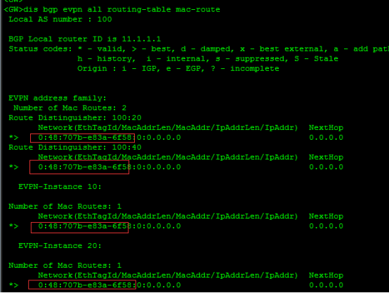 (3)对比VXLAN网关设备的ARP表项与其他VXLAN设备的ARP表项